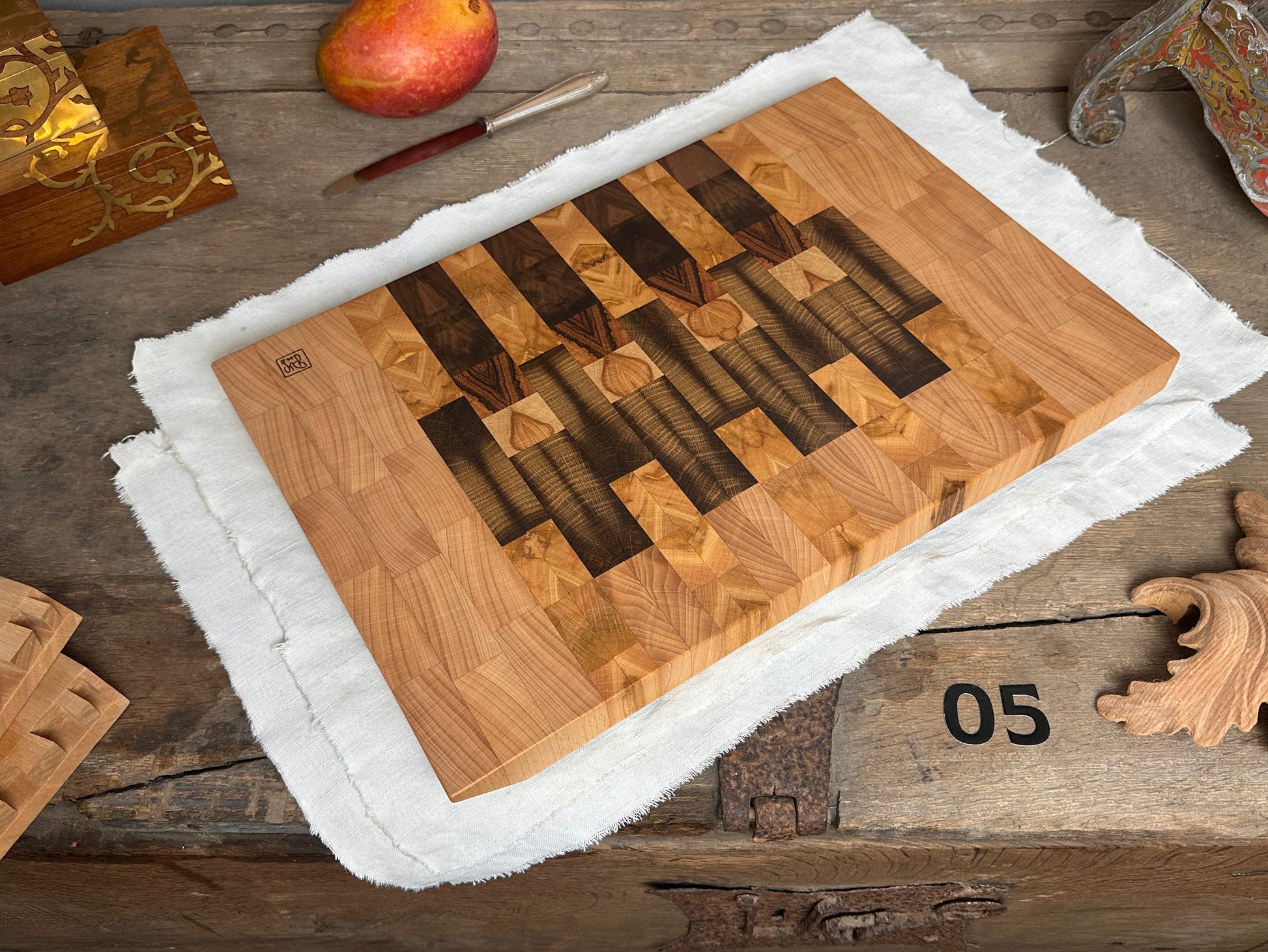 Dieses handgefertigte Hirnholz-Schneidebrett entstand in der Werkstatt von Johanna Röh in Kooperation mit Maira Kemme und verbindet präzises Tischlerhandwerk mit einem natürlich geölten Finish in meisterlicher Qualität; ein stabiles, nachhaltiges und absolut einzigartiges, massives Hirnholzbrett – ideal als hochwertiges Küchenbrett, Servierbrett, besondere Geschenkidee oder langlebiger Alltagsbegleiter. Und ja: Du bekommst genau dieses eine Brett, kein ähnliches. Hirnholz-Schneidebretter sind aufwändig in der Herstellung, dafür jedoch extrem robust, langlebig und messerschonend, da ihre senkrechten Holzfasern Schnitte durch Feuchtigkeit nahezu „selbst heilen“; unsere Bretter entstehen aus sorgfältig ausgewählten heimischen Hölzern, ergänzt durch Akzenthölzer, teilweise aus wiederverwendeten edlen Hölzern und Reststücken. Sie tragen deshalb durch alte Schraubenlöcher oder durch ihre individuelle Kombination und Maserung ihre eigene Geschichte – jedes Stück ein echtes Unikat.