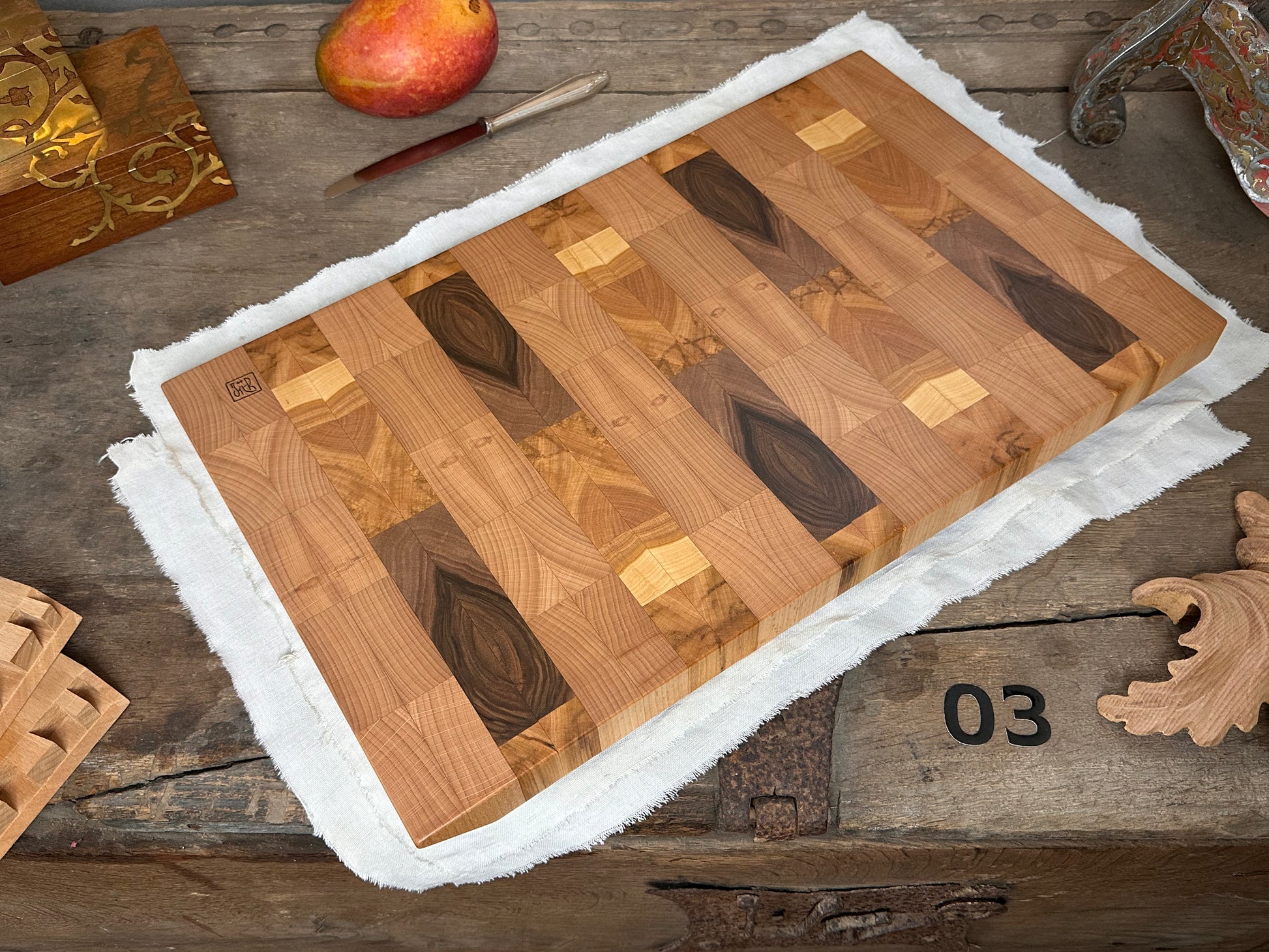 #03 Hirnholzschneidebrett ohne Gravur - Nussbaum, Kirsche und Buche